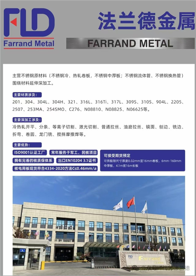 江苏法兰德金属制品有限公司立足无锡市场经过多年的快速发展,已成为一家集不锈钢加工、销售和技术服务为一体,享誉全国的综合性的不锈钢服务企业。自2010年起,法兰德连年跻身中国不锈钢制造业100强,中国民营企业500强。截止2010年12月31日,法兰德拥有员工122人,2011年销量达13.5万吨。法兰德多次被中国金属材料流通协会不锈钢分会评为“中国十大不锈钢流通企业”,并荣获全国4A级物流企业荣誉称号。 江苏法兰德金属制品有限公司目前已成为无锡华东地区的不锈钢流通集散地。 公司专业经营各种材质的进口、国产不锈钢板板材,管材等,主要经营钢种有:304不锈钢、304L不锈钢、321、316L、201、202、309S、310S、443、430、409L,镍基合金管,蒙乃尔合金钢管,哈氏合金钢板,哈氏合金钢管等.公司本着“质量信誉为本,客户服务至上”的经营宗旨,满足客户需求。我公司常年为食品加工、化工机械、医疗器具、家用电器、汽车和摩托车配件、太阳能工业等行业生产厂家提供质优价廉的不锈钢平、卷板,并可根据客户的要求订购和加工各种规格的不锈钢板,满足广大客户的需求。